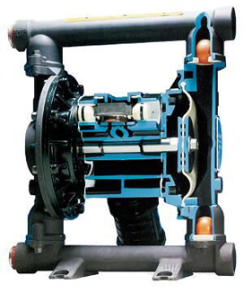 氣動(dòng)雙隔膜泵采用壓縮空氣、氮?dú)饣蛱烊粴庾鳛閯?dòng)力。主定向(氣動(dòng))控制閥將壓縮空氣分配至氣體腔室,向隔膜的內(nèi)表面上施加均勻壓力。同時(shí)排出的氣體從泵另一側(cè)后方通過(guò)氣閥組件導(dǎo)向端口排出。